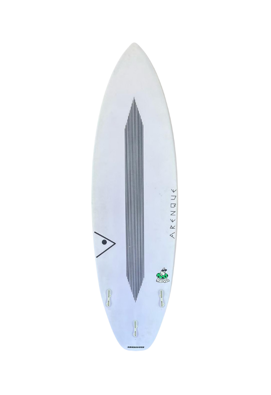 Com a chegada das piscinas, ajustamos a Skinny Goat para ondas pequenas: rabeta com kick tail, fundo double concave + vee bottom e menos volume, já que remada é menos importante. Resultado: mais agilidade e controle nas transições, sem precisar criar um modelo exclusivo para ondas artificiais.